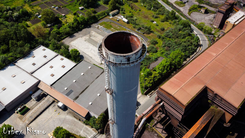 From above, the chimney looks like a giant scar in the landscape. The drone captures the scale of both the structure and the decayed industrial world surrounding it. Can you spot me?