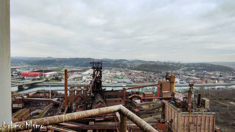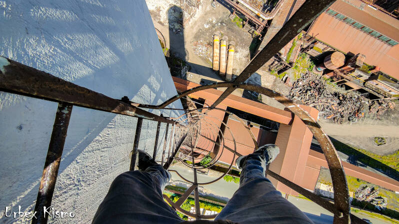 Climbing higher, every step feels more dangerous. With no safety gear and the wind howling through broken steel, the view begins to open up over the factory grounds.
