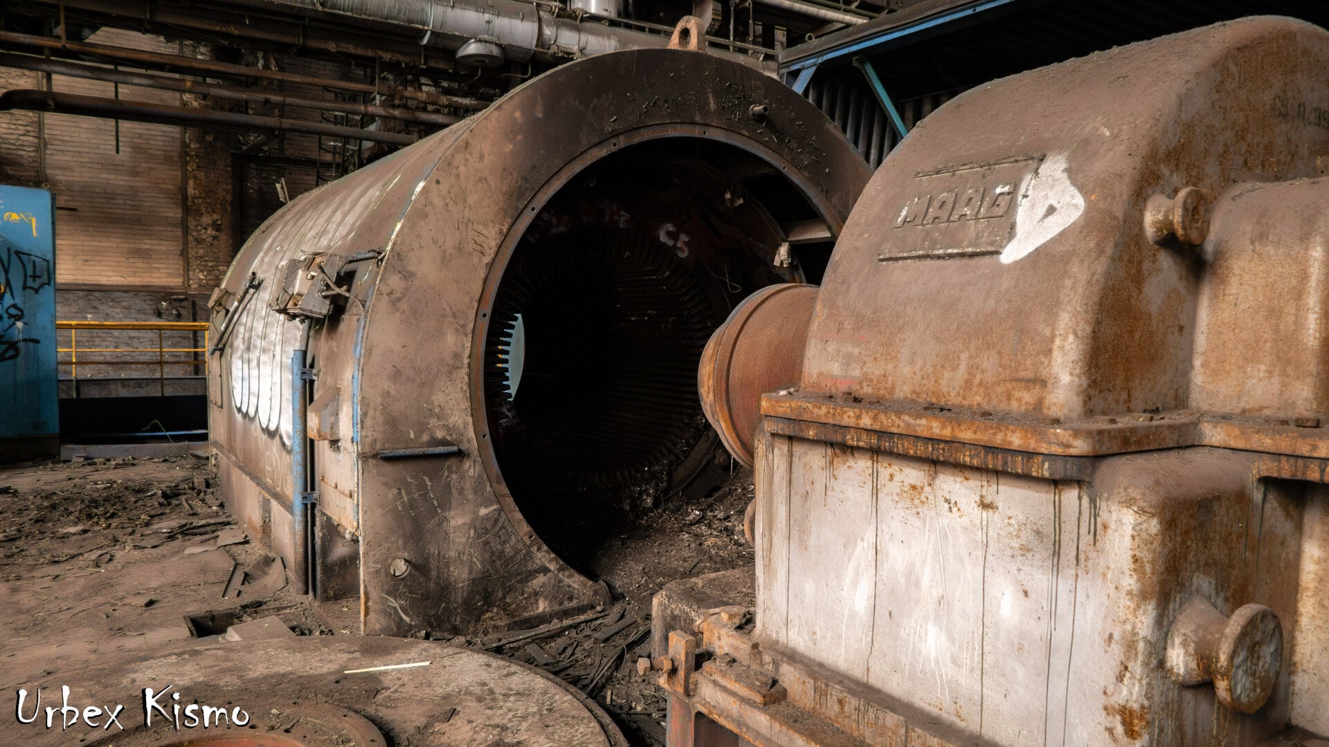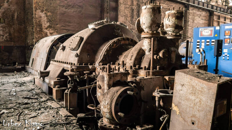 The SE6 was an electric turboblower installed to supply large volumes of compressed air. Powered by a 26 MW motor, it drove a massive compressor system. Due to the extreme noise levels, it was placed inside a dedicated insulated hall. When HFB was fully operational, this machine alone consumed up to 16 MW of electricity. One of the turbine blades are lost next to it.