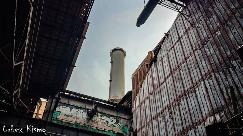 From the roof, the scale of the steelworks becomes evident. Cooling systems, gas pipelines, and structural reinforcements connected the power station to the blast furnace complex. Parts of the building have since been dismantled, marking the gradual dismantling of a site that once generated both energy and recovered surplus power for reuse.