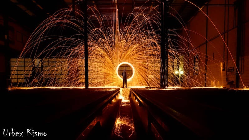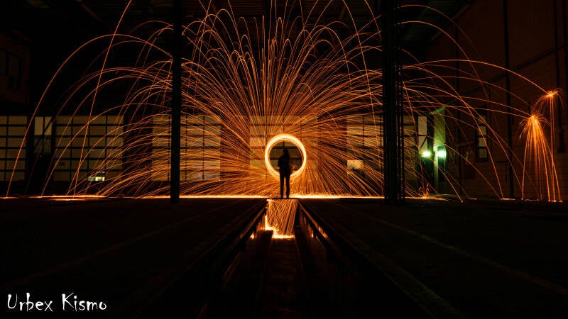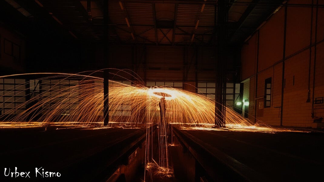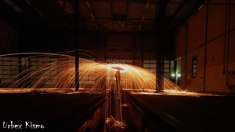 During an overnight stay at the HFB steelworks, steel wool added a dynamic layer to the massive industrial backdrop. Large open halls and steel structures allowed the sparks to travel further, creating wide circular patterns. Combining night exploration with controlled light techniques results in images that highlight both scale and atmosphere.